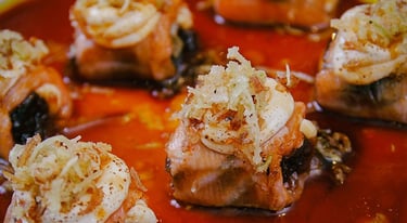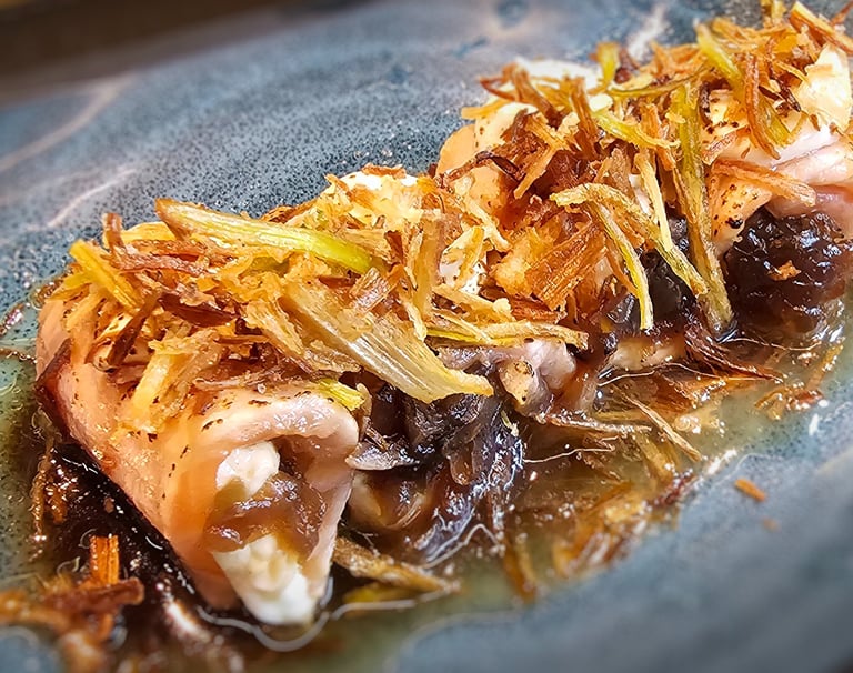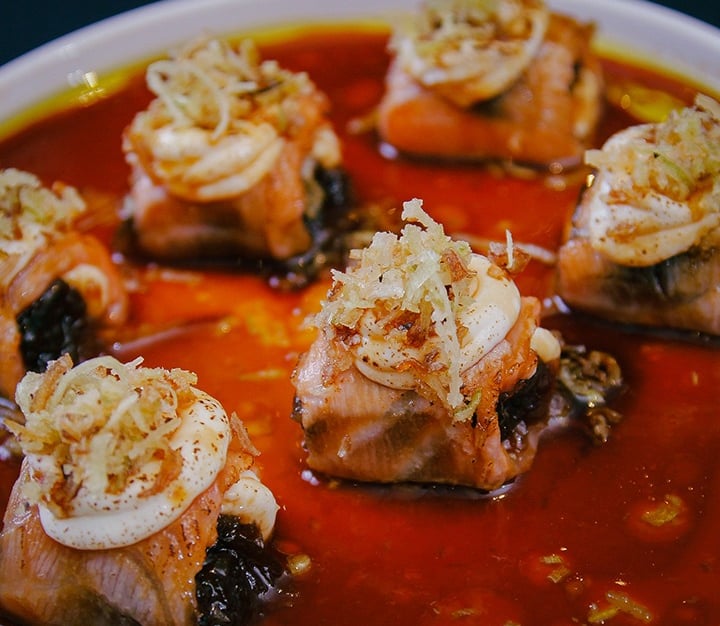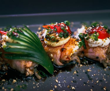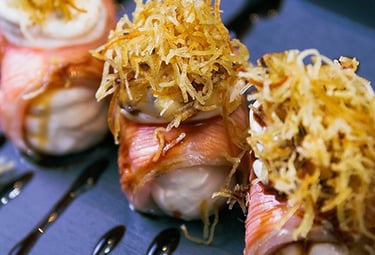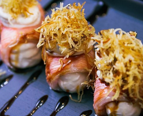Enrolado de salmão recheado com cream cheese, coberto com cebola caramelizada e flambado em um delicioso molho chef. Além de sua combinação única de sabores, este sushi alcançou a excelência ao apresentar uma textura perfeitamente equilibrada.