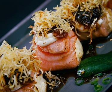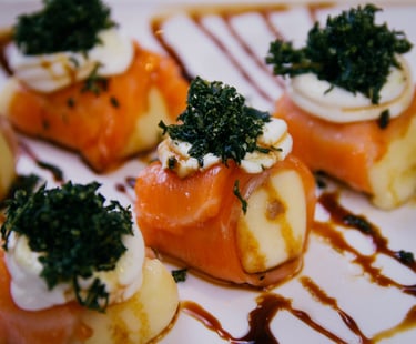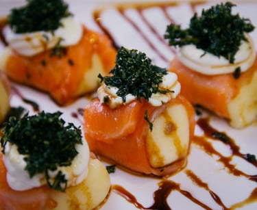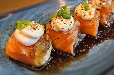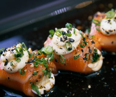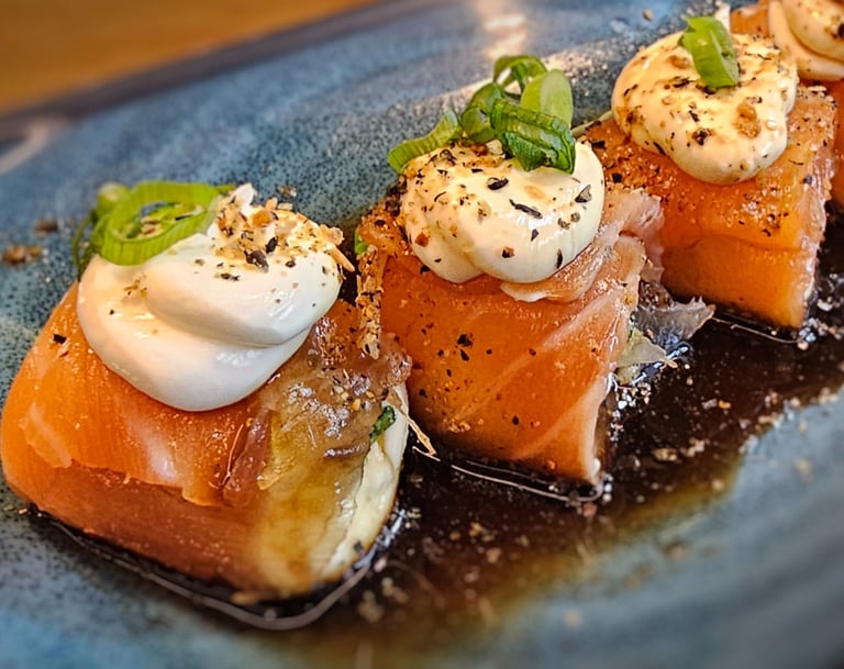 Delicioso Sushi de Salmão recheado com 3 tipos de Queijos selecionados que derretem na boca. Essa iguaria é uma verdadeira explosão de sabores e texturas, perfeita para quem busca uma experiência única e sofisticada na culinária japonesa.