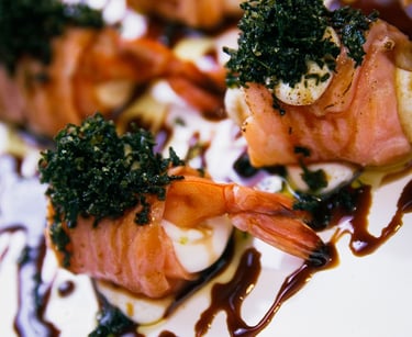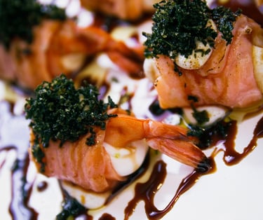 Nosso sushi de camarão especial com camarão enrolado no salmão, cream cheese e couve frita é um verdadeiro show de sabor e textura.